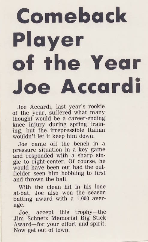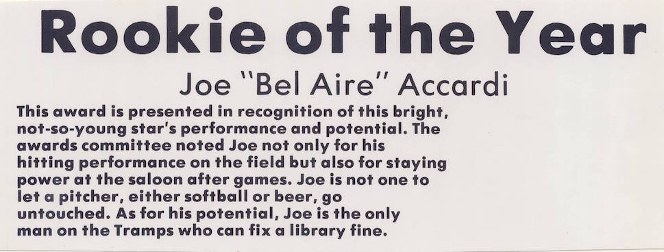 rookie0001That first season with the Tramps, I did well enough to earn a 1985 Rookie of the Year title and receive the coveted pasteup of a mock newspaper article written by the sports editor himself.